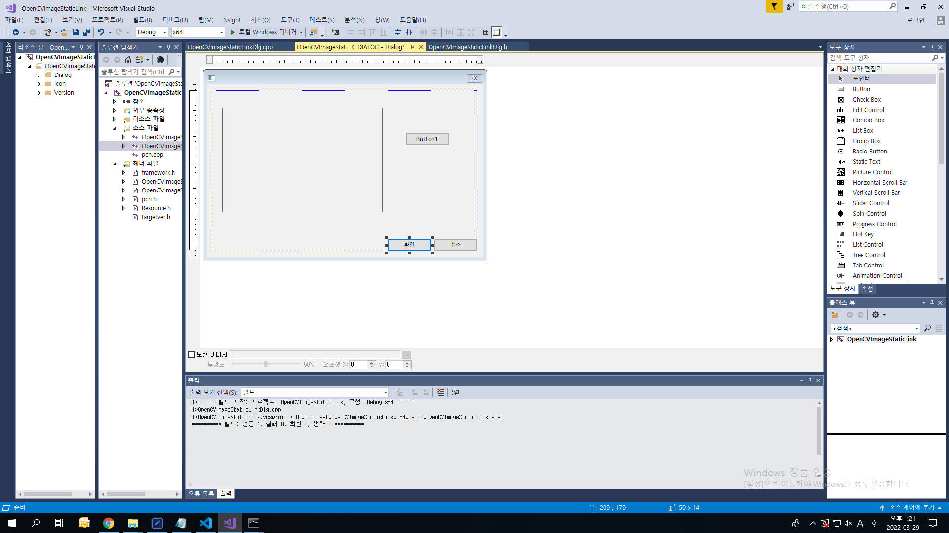 MFC에 OpenCV 사용을 위한 기본 설정을 한 후 ( 다른 사이트들에 쉽게 설명되어 있음)Dialog를 아래 그림 처럼 생성Picture Control (IDC_IMG) 로 생성/ Button CClientDC dc(GetDlgItem(IDC_IMG)); CRect rect; GetDlgItem(IDC_IMG)->GetClientRect(&rect); // 선언한 IDC_IMG에서 정보를 받아옴 SetStretchBltMode(dc.GetSafeHdc(), COLORONCOLOR); // SetStretchBltMode : 이미지를 확대하거나 축소할 경우 생기는 손실을 보정해 주는 함수 // COLORONCOLOR : 픽셀을 삭제합니다. 제거된 픽셀 줄의 정보를 보존하지 않고 삭제합니다 ..